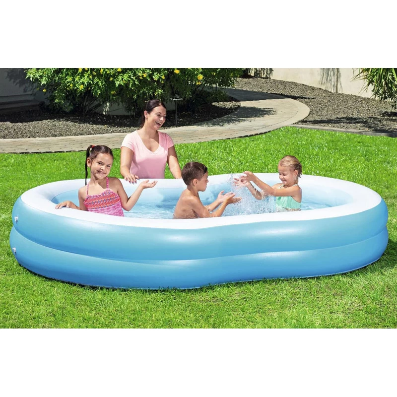 La piscine gonflable pour enfants Lagoon a la forme d’un « huit couché » et est constituée de deux anneaux. C’est l’une des piscines les plus économiques en termes de volume d’eau, tout en conservant l’espace intérieur utilisable. Elle convient aux jardins des maisons familiales. Les parois latérales sont larges et permettent de s’allonger confortablement. Vous n’avez besoin d’aucun outil pour la monter, il suffit de la gonfler.