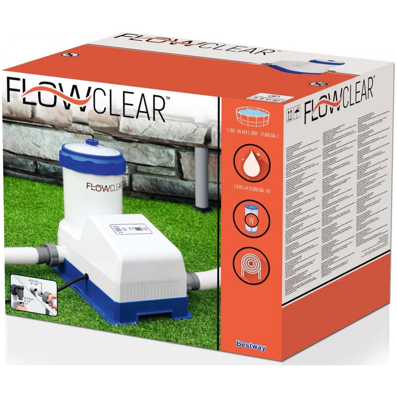 Caractéristiques de la pompe de filtration : Cette pompe de filtration pour piscine hors sol maintient la circulation d’une eau propre : elle pompe l’eau hors du bassin, puis la fait passer a travers une cartouche de filtration pour la rejeter enfin dans le bassin. L’eau est pompée par le tuyau d’entrée a un débit de 7 570 L/h, avant d’etre assainie par la cartouche de filtration et pompée a nouveau par le tuyau de sortie. Gardez votre piscine étincelante avec un minimum d’effort grâce a la pompe de filtration Flowclear™ 7 570 L Smart Touch Wi-Fi et l’application Bestway Smart Hub !