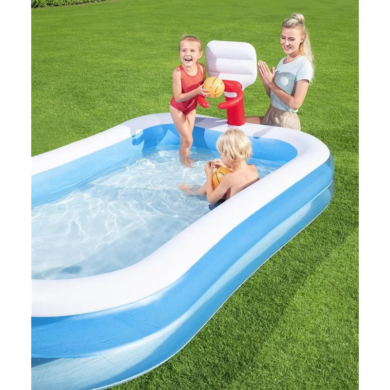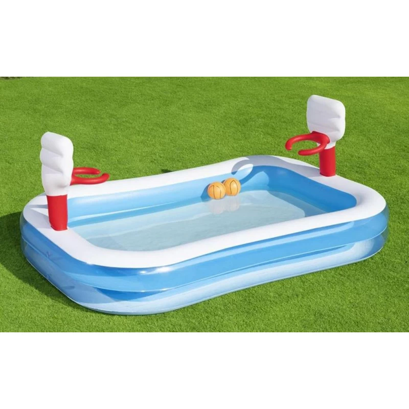La piscine gonflable pour enfants avec deux paniers de basket-ball permet une utilisation polyvalente – nager et jouer avec le ballon. La piscine est adaptée aux jardins familiaux, elle est robuste avec des parois latérales extra larges. La construction de la piscine est conçue avec un systeme de chambres a air. L’ensemble est livré avec 2 ballons gonflables. La vidange est facile grâce a la valve de vidange de fond. Une rustine pour les petites réparations est incluse.