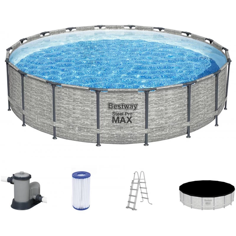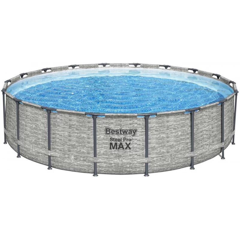 Envie d’une jolie et grande piscine pour vous rafraichir tout l’été ? Adoptez la piscine piscine hors sol Steel Pro Max™ ronde décorée d’ un motif effet pierres grises.