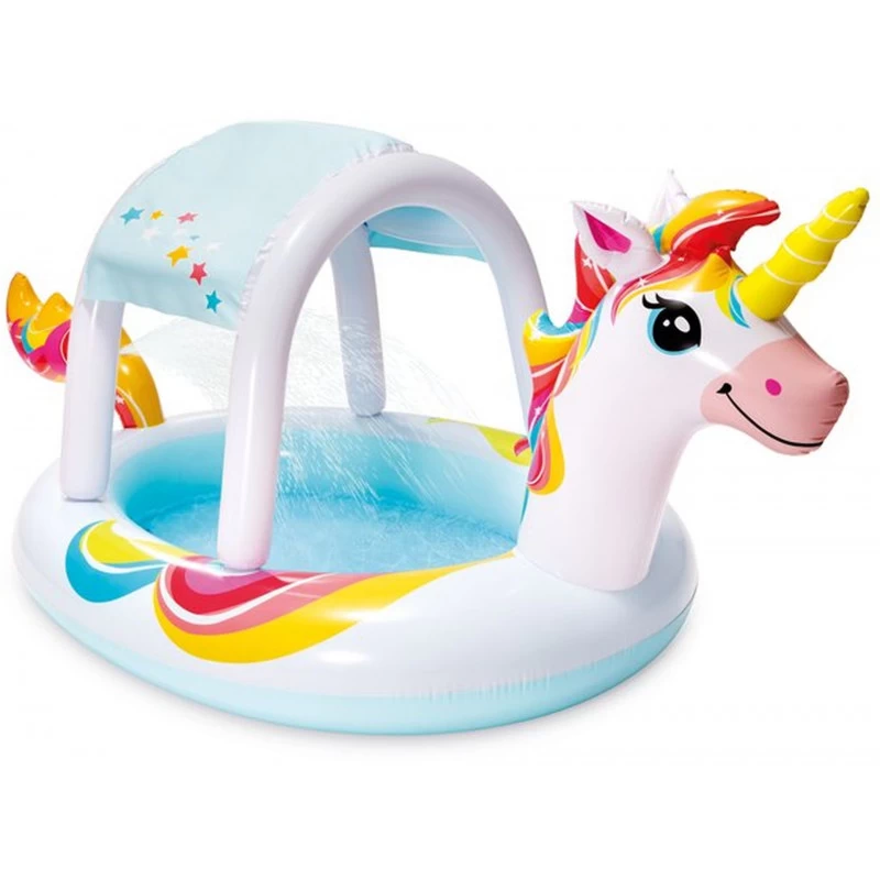 Licorne gonflable Intex pour enfantParfait pour rafraîchir un enfant en bas âge durant les journées tres chaudes, cette licorne gonflable Intex fera plaisir a votre enfant. Elle possede une fontaine pour le rafraîchir durant sa baignade et un parasol amovible pour le protéger des rayons du soleil.Et pour la vider, cette piscinette en forme de licorne d’une bonde d’évacuation de l’eau.